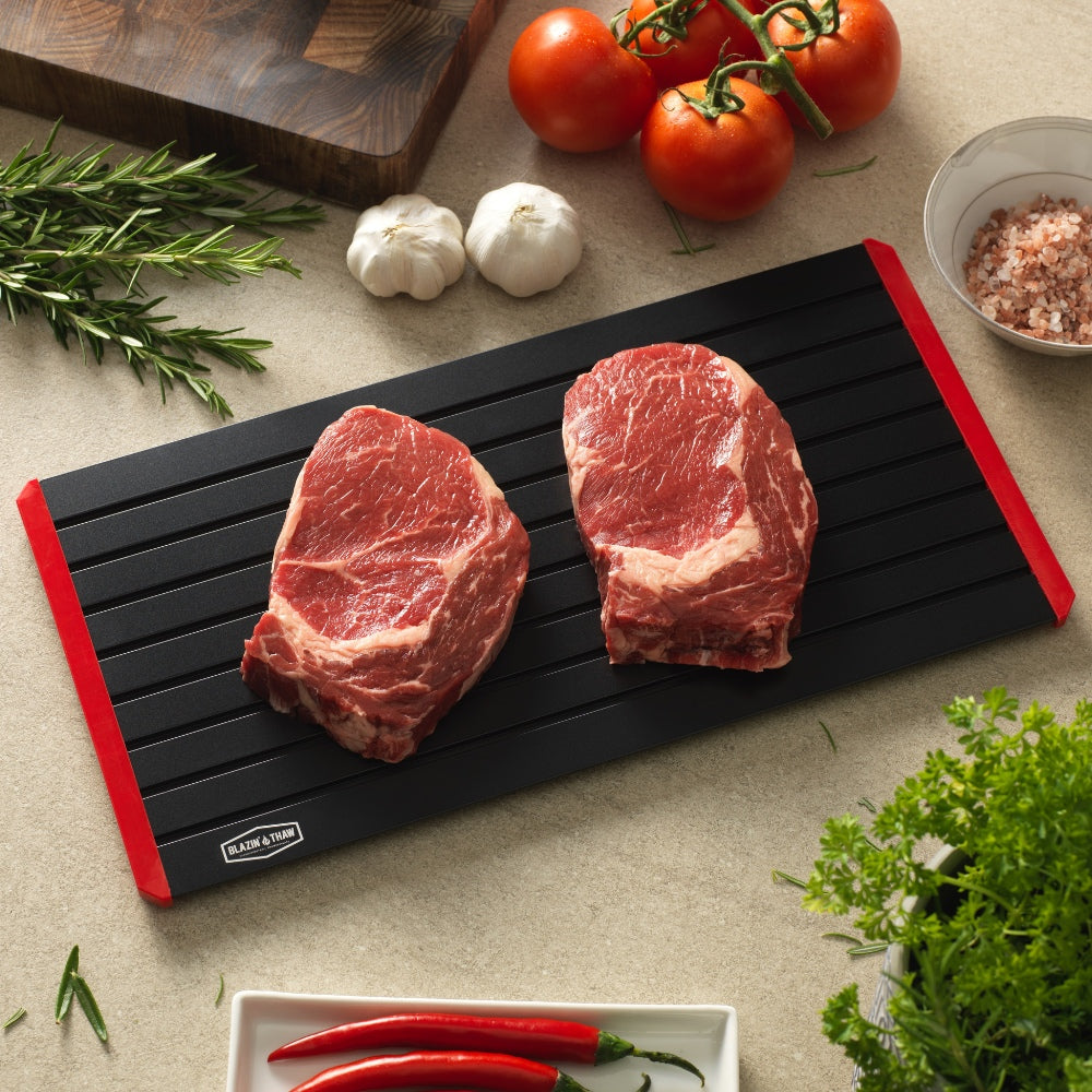 Place frozen foods or meats on top of your Blazin' Thaw Defrosting Tray. Wait until frozen food or meat is evenly thawed.