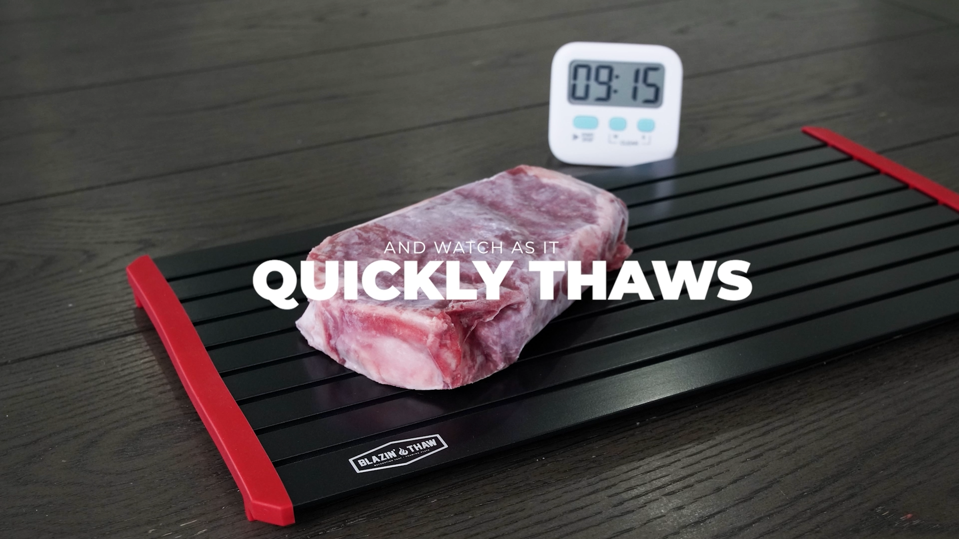 Step 2: Place frozen foods or meats on top of your Blazin' Thaw Defrosting Tray. Wait until frozen food or meat is evenly thawed.